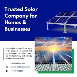 Electrobeam Solar is a trusted solar company in Jaipur offering reliable and affordable solar energy solutions for homes, businesses, and industries. Specializing in rooftop solar systems, on-grid and off-grid installations, EPC services, and subsidy assistance, Electrobeam Solar ensures high-quality panels, expert installation, and long-term performance. With a strong focus on sustainability, energy efficiency, and customer satisfaction, the company helps Jaipur residents reduce electricity bills and transition to clean, renewable solar power with confidence.